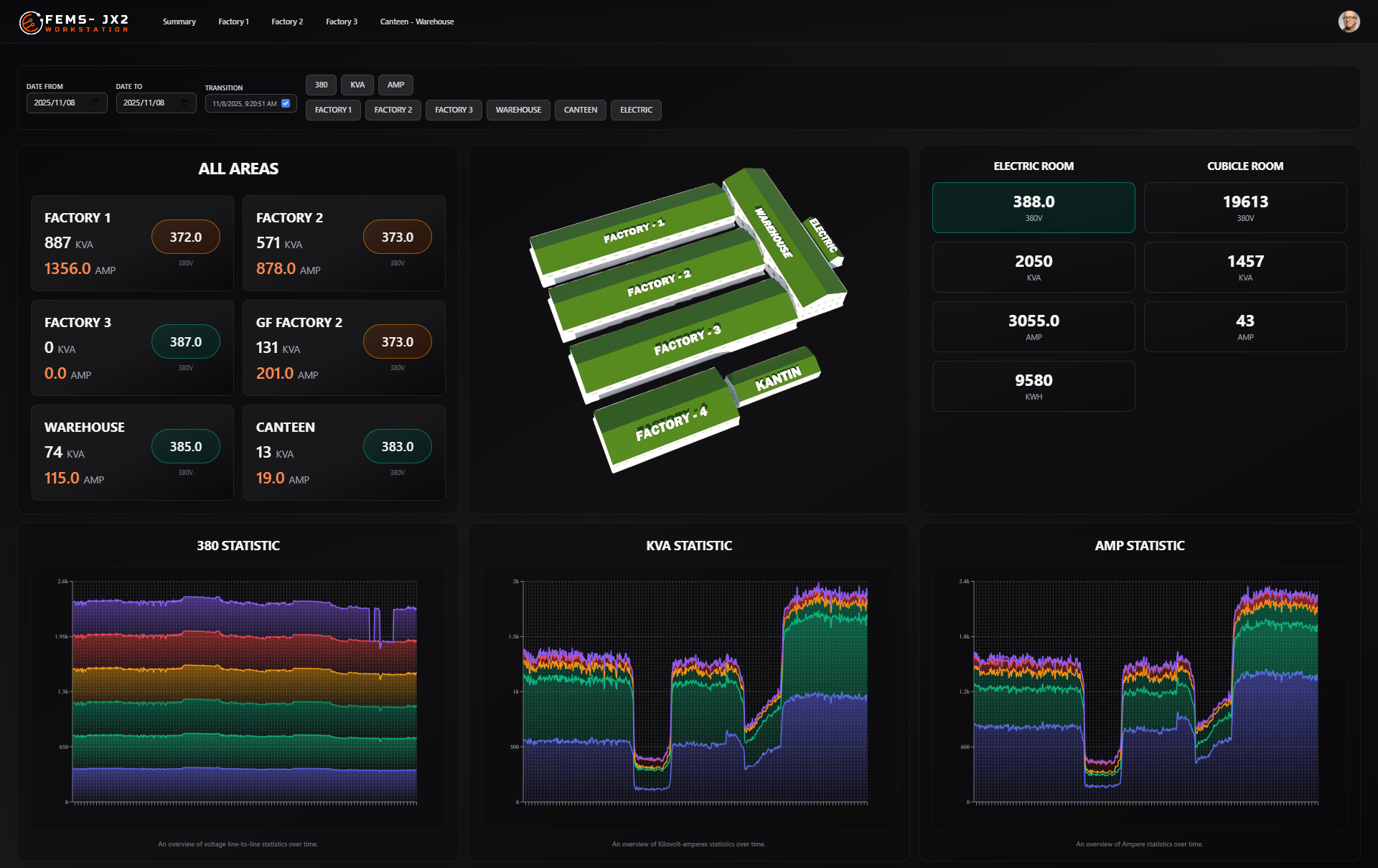Real-time electrical panel metrics KWH, KVA, APM, and Voltage Line-to-Line. Centralized oversight across all factories and individual rooms within each plant.